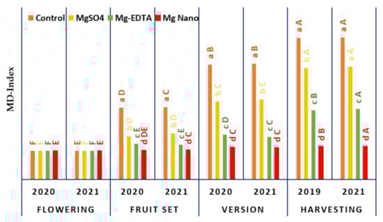 Figure 1 depicts the magnesium deficiency index (MD-index), which is a function of berry developmental stages (BDSs) for all magnesium types. When seasons, BDSs, and magnesium application forms are examined, the MD-index demonstrates a significant influence of p < 0.05. Considering the different magnesium forms, it is obvious that the Mg-NPs treatment produced fewer symptoms of magnesium deficiency than the other magnesium forms. Observably, the effect of ‘Mg-NPs’ was that there was no evidence of deficient symptoms prior to the veraison stage (berry change color) and that it rose somewhat until the harvesting stage was completed. For vines treated with Mg-EDTA, MgSO4, and control treatments, deficit symptoms were observed prior to fruit set, increased significantly during veraison, and persisted until harvesting. However, during the vegetative growth stages, the ‘Control’ treatment exhibited the most deficiency symptoms. The severity of Mg was noticed on ‘Control’ vines that were unaffected by the Mg forms, but the control vines had more symptoms throughout the vegetative growth stages. On sandy soils, symptoms of a magnesium deficit appear on vines during the growth season, necessitating monthly spraying of vines to compensate for the shortfall and thereby avoiding deficient occurrence. Regardless of the magnesium supply to the vines, 750 g of magnesium sulfate per 600 L of irrigation water is employed to avoid magnesium shortages. It is distinguished by the yellowing of older leaves and a yellow tint between the veins of the leaves.