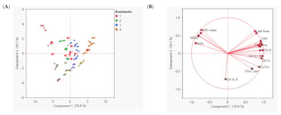 Principal Component Analysis (PCA) representing seasons and magnesium application forms to ‘Superior seedless’ vine grown in sandy soil and salt conditions, plotted with the contribution of each parameter on the two PCA axes (A) and all the physiological and biochemical parameters measured in leaf during the growing season (B). Principal Component Analysis (PCA)-Variable correlation of 7th leaf.