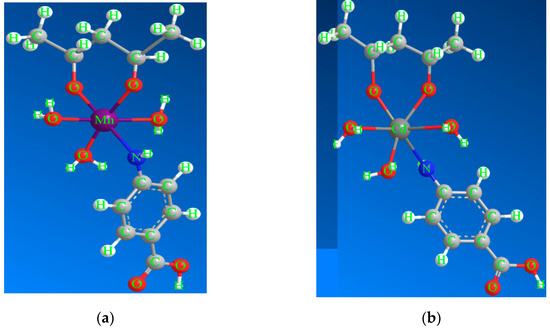 Infrared spectra were obtained in KBr disks using a Thermo-Nicolet-6700 spectrometer, between 400 and 4000 cm−1. Table 2 shows the patterns of FT-IR of pure PVA, P-ABA, and their complexes. The identities of the Mn(II) complex and Cd(II) complex were confirmed by FT-IR. They clearly show a different fingerprint from the parent PVA and P–ABA [43,48]. Figure 2 shows a closer view of the fingerprint area. We found that the ν(O–H) band, which appears at 3400 cm−1 in the spectrum of PVA, was shifted to a lower wave number (3280–3250 cm−1), indicating a sharing of this group in the bonding with the metal ions. The stretching frequency of ν(CH2) was at 2890–2930 cm−1 (a slight shift compared to the PVA spectrum at 2905 cm−1). The peak of the ν(C–OC) stretch vibration was recorded at 1150 cm−1 in the ligand spectrum and 1180–1178 cm−1 for the complexes [43]. The stretching frequency of ν(NH2) was observed at 3234 cm−1 for P-ABA as a free ligand, while this value was shifted to 3243–3220 cm−1 after complexation [48]. Moreover, the ν(C=O) stretch vibration was recorded as a medium intensity strip at 1680 cm−1 of P-ABA in all complexes, and the spectrum underwent almost no shifting. The tape characteristic of the ν(C=N) stretch vibration was recorded at 1640 cm−1 for P–ABA (a slight shift compared to the ligand spectrum) at 1650–1620 cm−1 and the para substitution was present at 750 cm−1 [48]. Briefly, PVA coordinated to the metal ions in bidentate mode through oxygen atoms, while P–ABA coordinated in the monodentate mode through the nitrogen atom. A broad band with medium intensity located in the range 3388–3337 cm−1 was assigned to ν(OH) of (H2O) for all complexes. In addition, the appearance of the absorption bands, which are represented by characteristic absorption peaks at 522–515 cm−1 and 430–422 cm−1, corresponded to ν(metal–O) and ν(metal–N), respectively [49].
