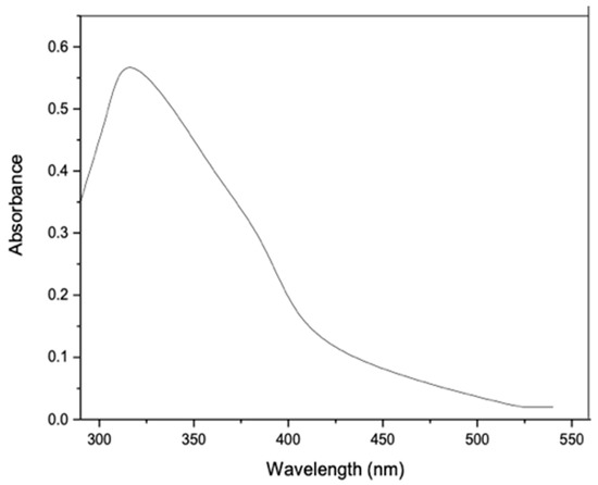 The UV-visible absorption spectrum of PVA, P–AMB (DMSO, 5 × 10−5 M), and their Mn(II) and Cd(II) complexes are shown in Table 3, absorption peaks were found at 45,248–35,087 cm−1 [50,51], which can be attributed to the π–π*, n–π* transition of the PVA and P-ABA. The electronic spectrum of manganese (II) complex, displaying the electronic spectral band at 19,685 assigned to d-d transition ‘6A1g → 4Eg’ (Figure 3), was drawn to show UV-visible of the Mn(II) oxide nanoparticles. The magnetic moment was 5.53 B.M., which is representative of the octahedral geometry of Mn+2, while Cd+2 is the nonmagnetic ion; it only has bands for π–π*, n–π*, which are assigned to the intra-ligand charge–transfer transitions [52,53].