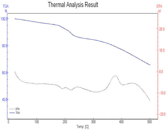 Figure 4 depicts the TG, DTG, and DTA. The complex’s thermal decomposition process (1) includes five stages. These steps occur in the temperature ranges 70–140, 142–244, 246–378, 380–403, and 405–600 °C. The first and second mass loss correlates well with the release of one crystalline water and three coordinated water molecules (calc. 20.59%, found 18.02%) (DTG peak at 88 °C). This corresponds to a broad endothermic peak in the DTA curve at 90 °C. The third step represents a loss of weight, indicating expulsion of a para-aminobenzoate ligand (calc. 39.16%, found 37.78%). This step composed a DTG peak at 302 °C, associated with an endothermic peak at 304 °C in the DTA trace. The fourth and fifth steps were decomposition products of the remainder of the polyvinyl alcohol ligand (calc. 21.14%, found 20.06%). These steps are manifested in the DTG curves as peaks at 392 and 435 °C, and the DTA trace shows an exothermic effect at 394 and 437 °C. The ultimate product at 600 °C is consistent with the formation of MnO as a residual part (calc. 20.25%, found 19.45%).