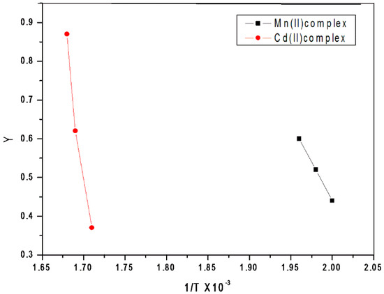 The activation variables ∆H*, ∆S*, and ∆G* for the degradation stages of the mentioned complexes are recorded in Table 5. The negative ∆S* values of stages for the Mn(II) complex and Cd(II) complex decomposition suggest that the stimulated compound was forced to be high by the reactants; and the reactions were lower than normal. The positive ∆G* values indicate the nonspontaneous decomposition of the reaction.