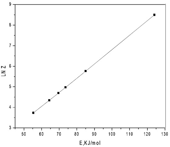 The kinetic compensation impact (KCI) states that the rate drop expected as the activation energy increases does not materialize in a specific set of processes. The KCI, which was observed in a number of nonthermal processes, appears to be valid here. It was noted that the value of energy (E) for the specific processes conformed to a straight line, as determined by the linear square technique for the two complexes (Figure 6), and is drawn as follows: