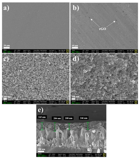 Low-resolution SEM images of (a) TiO2 film and (b) TiO2–rGO film (scale bar—10 µm). High-resolution SEM images of (c) TiO2 film and (d) TiO2–rGO film (scale bar—100 nm). Cross-sectional SEM image of (e) TiO2–rGO film (scale bar—200 nm).