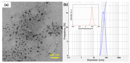 The particle size and zeta potential were determined by a Nano Particle Analyzer SZ-100 (Horiba Scientific, Kyoto, Japan) at 25 °C and transmission electron microscopy (TEM, Philips, CM-120, Eindhoven, The Netherlands) at an acceleration voltage of 120 kV. The prepared chitosan particles had a mean size of about 56 nm and high zeta potential of +98.7 eV with a narrow size distribution, as shown in Figure 1.