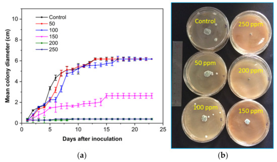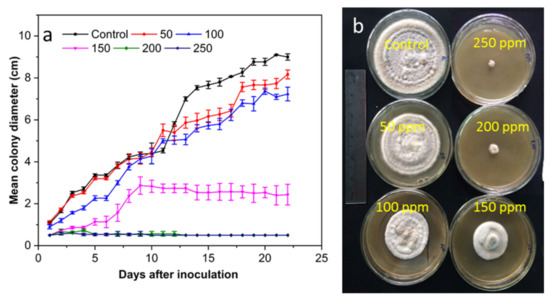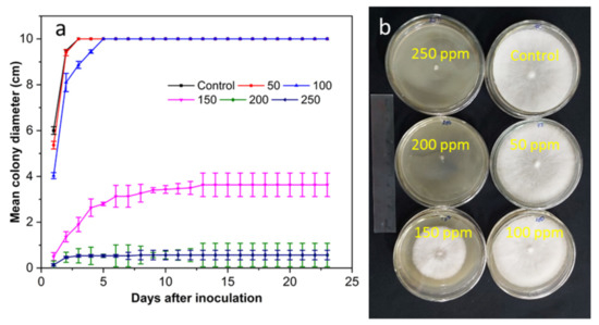 (a) The antifungal activity of SCNs at different concentrations against A. alternate incubated at 28 °C for 22 days and (b) plates incubated for 16 days.