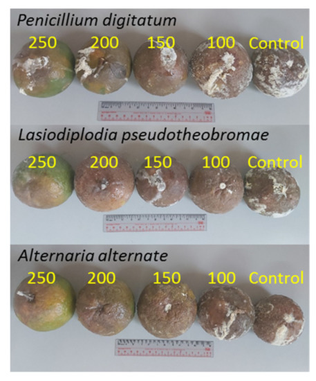 Citrus is an important fruit with a world production estimated at over 100 million tons per year [1]. In Vietnam, citrus is widely grown as a high economic fruit in the Northern and Southern provinces. However, citrus fruits have a low pH value, high moisture content, and many nutrients making them very susceptible to attack by pathogenic fungi [2]. So, the postharvest losses usually are high during the storage stage, and the loss rate is about 15–35% of the total output, which causes severe economic losses after harvest. It was reported that Lasiodiplodia pseudotheobromae, Alternaria alternate, and Penicillium digitatum were the main disease problems with blue mold, green mold, and watery rot and unexpected flavor during postharvest storage [3,4]. So far, an effective fungicide has mainly managed these fungi [5], but its intensive use may cause resistant isolates to develop and pose several risks for human and environmental health. Therefore, it is necessary to create safe alternatives for controlling postharvest rots [6].