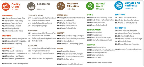 36]. The criterion was established mainly for the design and project development process, but the recent version has expanded its application also to the process of construction, operation, maintenance, and demolition. In addition to the certification, the objective of Envision is to promote sustainable solution in technical, environmental, social and economic terms, providing goals and performance levels through the guidelines. This rating system consists of five sections: quality of life, leadership, resource allocation, natural world, and climate and risk, each of which is further divided in sub-categories (