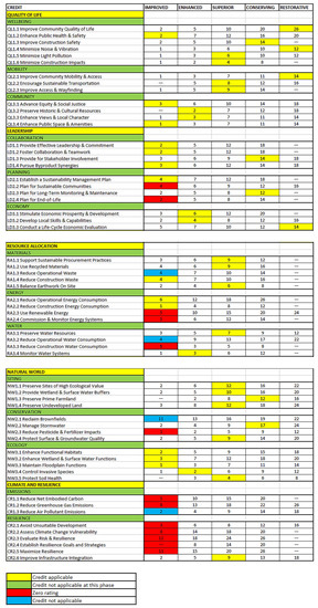 The application of a rating system depends on the analysis characteristics and many critical reviews were carried out to compare the potential of these tools for assisting practitioners in reaching environmentally sustainable goals. Mattinzioli et al. have investigated the most prominent current rating systems and determined that Envision evaluates the three-pillars of sustainability, macro-categories and life-cycle more homogenously than other systems [