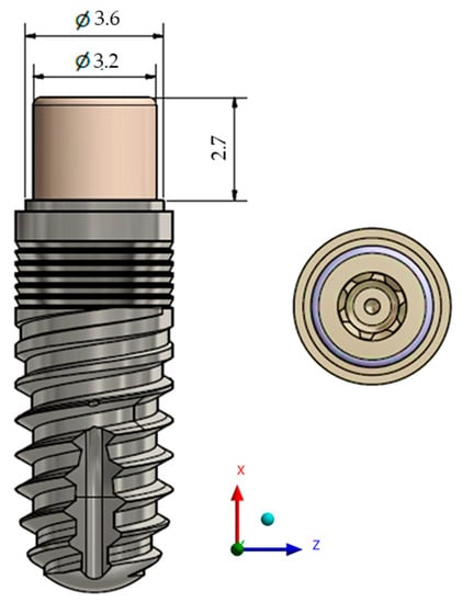 The mechanical characteristics of this material make it very attractive for many biomedical applications thanks to an elastic modulus of 4000 MPa (value between cortical and cancellous bone tissues elastic modulus), a fracture resistance up to 1200 N, flexural strength higher than 150 MPa, water absorption of 6.5 µg/mm3, water solubility inferior to 0.3 µg/mm3, melting range of approx. 340 °C, bond strength higher than 25 MPa and hardness of 110 HV [31,32]. Despite that, it presents higher stress concentration on its structure than zirconia abutment due to the increased flexibility. However, the threshold of 150 MPa was not achieved what means that mechanical failures would not occur.