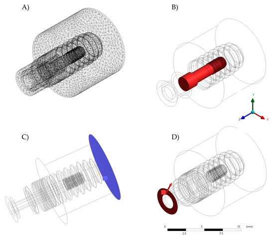 Numerical model and boundary conditions. (A) Mesh model containing implant, (B) bolt pre-tension, (C) Fixed support at the base and (D) Force load applied on the top.