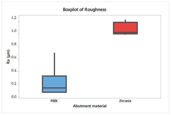 Boxplot of average roughness (Ra) according to the abutment material.