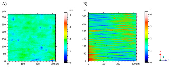 Representative images of the surface topography with shaped removed, showing different topographic patterns. (A) Bio-HPP and (B) Zirconia abutment.