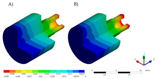 Convergence results verification using Total Deformation (mm). (A) Zirconia abutment and (B) Bio-HPP abutment.