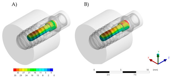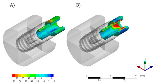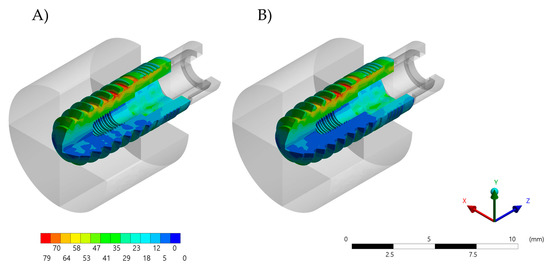 Von-Mises stress maps (MPa) in the implant fixture. (A) Zirconia abutment and (B) Bio-HPP abutment.