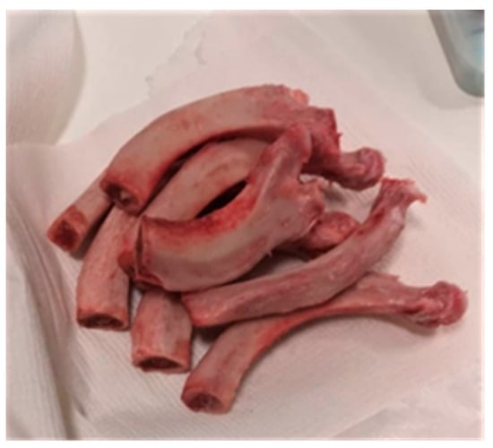 Porcine ribs, derived from a 15-months-old pig from the local slaughterhouse (Figure 1) were chosen, as their trabecular bone structure is similar to that of human facial bones [27].