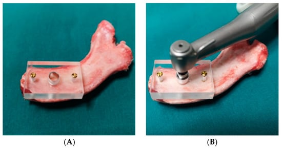 First, the surgical guide made from Plexiglas was stabilized on the specimens to be prepared using osteosynthesis screws (Figure 3A). The drill bits were then used to prepare the implant site in the ribs using the sequential technique prescribed and indicated by the manufacturer of the drills (Figure 3B).