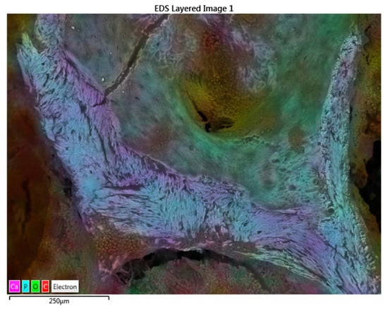 SEM-EDX map factor of the T0 sample. The map factor allowed us to observe the distribution of the Ca, P, O, and C electrons that compose the bone.