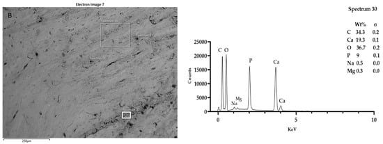 The preparation protocol of bone samples for SEM observation was followed as described: after fixing the samples with glutaraldehyde, the bones were rinsed with distilled water to remove the fixative and were dehydrated in an ascending series of alcohols (50%, 75%, 95%, 100%), left to dry on absorbent paper for 48 h and observed with the scanning electron microscope. For all the samples, the chosen area included the cortical and part of the medullar portion (Figure 4). The areas were observed randomly in different positions at different degrees of magnification in secondary electron (SE) mode. The parameters used were accelerating voltage (AV) 7.00 kV, spot size 20 μm, and working distance between 13.6 and 14.1 mm.