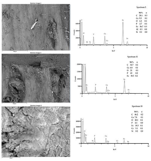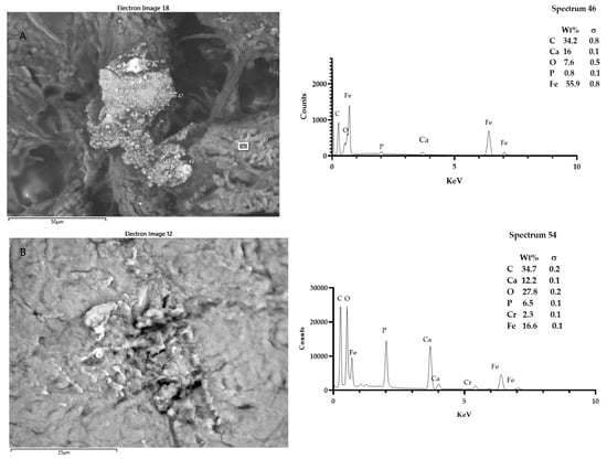 SEM-EDX analysis of samples T3 (A), and T4 (B). Regarding T3 and T4 samples, the presence of a few fields showing electron beam reactive particles could be observed. Microanalysis showed the presence of iron particles and chrome in addition to calcium phosphate. Spectra outputs were realized using GrapPad Prism 9.3.1.