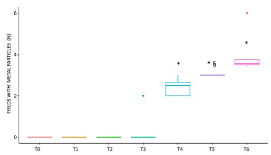 Graphical representation of the spotted fields with metal particles. The difference in the number of fields with metal debris was significant between T5 and T0, as revealed by the Wilcoxon test, indicated on the graph with §. The Bonferroni post-hoc analysis revealed a statistically significant difference in samples T4, T5, and T6 (p value < 0.05), indicated on the graph with *.