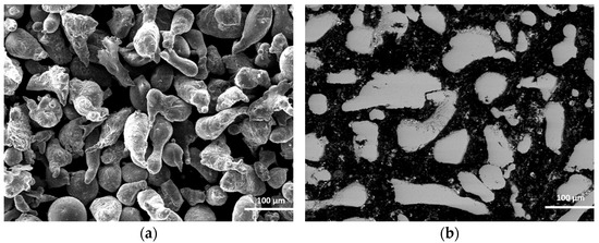 Iron-based powder: (a) global morphology, (b) cross-sectional microstructure.