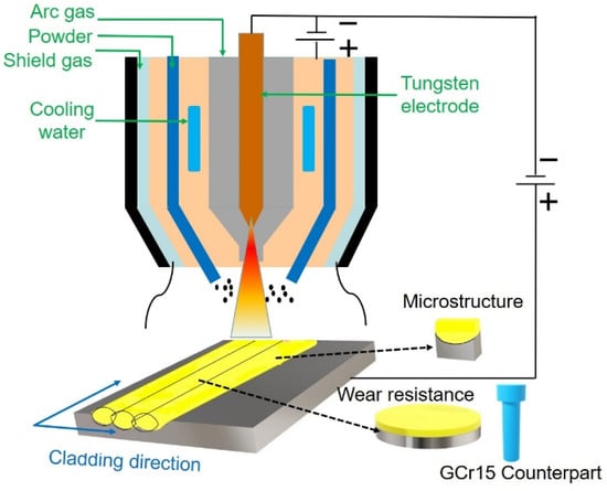 Plasma cladding has the advantages of strong metallurgical bonding, high efficiency and low dilution rate so it is seen as one of the most effective surface treatment means, being widely applied in surface modification in part repair and remanufacture [10,11,12,13]. Compared with high velocity oxygen-fuel (HVOF) and plasma spraying [14,15,16], plasma cladding can deposit a metallurgically-bonded thick coating on the substrate. During the plasma cladding process, part of the substrate surface is remelted and comixed with the melted feedstocks and then they solidify together, resulting in good metallurgical adhesion between the substrate and coating. Meanwhile, plasma cladding is more attractive than laser cladding in industrial applications for its relatively low cost and high efficiency [17,18,19].