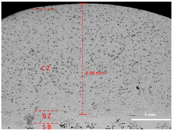 Figure 4 shows the global cross-sectional microstructure of the iron-based alloy coating prepared with a 50 A plasma arc current. The separate coating zone (CZ), bonding zone (BZ) and substrate (SB) can be clearly seen. The total coating thickness reached about 3.66 mm.
