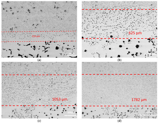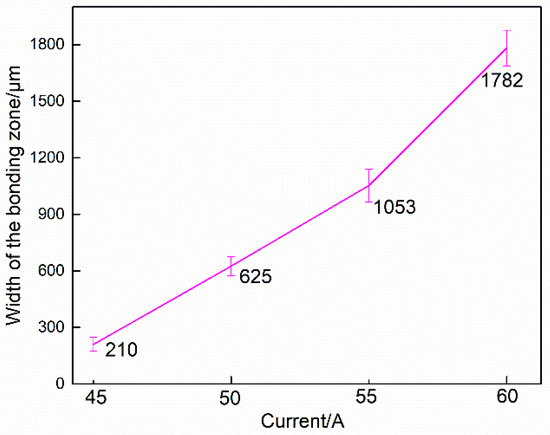 Microstructure of the bonding zone: (a) 45 A, (b) 50 A, (c) 55 A, (d) 60 A.