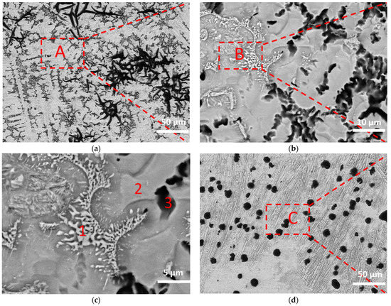 Figure 7 shows the cross-sectional microstructure of the iron-based alloy coating prepared under a 50 A plasma arc current. Austenite dendrites were formed in the coating zone. With the increase of the distance from the bottom side of the molten pool to the top surface, the temperature gradient (G) decreased and the solidification rate (R) increased gradually at the same time, which would lead to the ratio of temperature gradient to the solidification rate (G/R) decreasing gradually [8]. Consequently, the dendrites would grow preferentially. Figure 7b shows a magnification of position A. Secondary carbides precipitated from a supersaturated austenite grain. Figure 7c shows the selected positions for element analysis in the magnification of zone B. The detailed elements analysis results are listed in Table 4. The carbon content at position 1 was higher than that at position 2 due to the fact the carbon contents in carbide were much higher than the maximum solubility of carbon in solid solution during cooling. At point 3, the main element was carbon besides Fe, Al and Si. Therefore, point 3 was identified as graphite. In the matrix phase of γ-Fe, aluminum was solidly dissolved into the matrix phase and played a part in solution strengthening [34]. On the whole, the graphite existed in clusters as seen in Figure 7a, while it precipitated intermittently along the austenite grains as shown in Figure 7b.