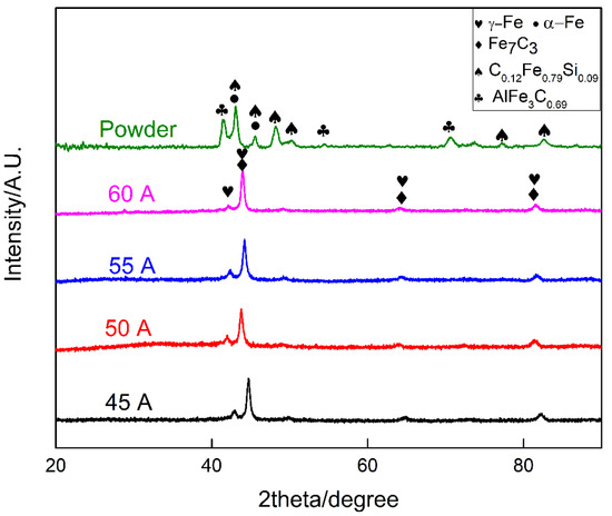 Figure 8 shows the X-ray diffraction patterns of the powder and the coatings prepared at different plasma arc currents. The main phases in the powder were α-Fe solid solution and ternary compounds, including C0.12Fe0.79Si0.09 and AlFe3C0.69. Austenite and Fe7C3 carbide were the main phases of the four coatings. During the plasma cladding, the powder materials experienced rapid-melting and rapid-cooling process. With the increase of the plasma arc current, the overheating extent of the powder materials increased and the cooling time of the melting was prolonged which was beneficial for carbon diffusion and decarburization of cementite as well as the retaining of dendrite austinite. In addition, aluminum was used as alloying element for two purposes. One was to reduce the iron-based alloy’s density. The other was to enabled precipitation hardening effect by the decomposition of the supersaturated austenite to form strengthening phase or take the effects of solid strengthening [35,36], while, in the coatings, no aluminum compounds appeared like the ternary compound AlFe3C0.69 phase in the powder. Generally, the addition of aluminum directly substituted the heavier iron atoms as well as caused a dilation of the lattice [34]. Consequently, the aluminum element in the iron-based alloy played a role of solution strengthening mainly, which would improve the wear properties of the coating.