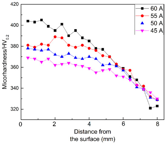 Figure 9 shows the coatings’ microhardnesses. The coatings’ microhardnesses presented a gradient distribution and increased from the bonding zone to the cladding layer’s upper surface. The mean microhardnesses of the iron-based coatings were 363, 378, 388, 402 HV when the plasma arc currents were 45, 50, 55 and 60 A, which were higher than that of the CGI substrate. The iron-based alloy coatings’ hardness increased with the increase of the plasma arc currents. The high hardness of the iron-based coating came from the precipitated secondary carbides formed in the coatings. Deng et al. deposited Fe-Mo alloy coating with the mean microhardness of 750 HV, which was mainly due to the rapid cooling of the fine grain microstructure and the formation of a hard intermetallic layer [20]. The molybdenum solid solution in α-Fe phase also contributed to the high microhardness. In addition, Cheng et al. reported the Fe–Cr–C iron-based coating’s microhardness enhancement was also due to the refined microstructure and strong super-saturation solution hardening of Cr to the iron matrix and the hard Cr7C3 phase [13]. Therefore, the change of microstructure led to the increase of coating hardness, which could be helpful to enhance the coating’s wear resistance.