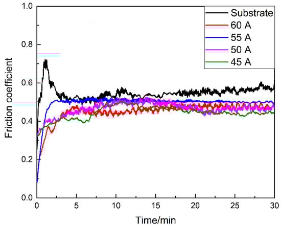 Figure 10 shows the frictional coefficients of the iron-based alloy coatings and the CGI substrate. The frictional coefficient vibration, as a function of the testing time and the abrasive process, could be divided into three segments including primary abrasion, normal abrasion and rapid abrasion [37]. The frictional coefficient results indicated that only primary abrasion and normal abrasion happened during the testing. The coatings’ frictional coefficients were approximately in the range of 0.51–0.46 while the CGI substrate’s frictional coefficient was 0.55.