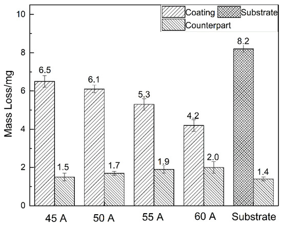 Figure 11 shows the wear mass losses of the coatings, the CGI substrate and corresponding counterparts after the wear tests. The coating’s wear mass loss decreased with the increase of the plasma arc current. The iron-based coating prepared at a plasma arc current of 60 A exhibited the lowest mass loss of 4.2 mg in the four coatings. As compared to the mass loss of the CGI substrate with the value of 8.2 mg, the coatings’ wear mass losses were significantly reduced, which reflected that the coatings’ wear resistances were higher than that of the CGI substrate. The main reason for the good wear resistance of the iron-based alloy coatings prepared by plasma transfer arc cladding was that the carbide precipitated in the coating acted as the wear-resisting skeleton to enhance the coating’s wear resistance and the precipitated graphite acted as a solid lubricant to lower the frictional coefficient, simultaneously. The GCr15′s hardness was about 60–62 HRC, which was approximately equal to 700–760 HV, while the microhardness of the CGI substrate was in the range of 280~300 HV. GCr15 was thus much harder than the CGI substrate. As for the GCr15 counterpart, GCr15′s martensite and carbides mainly cut into CGI substrate during wear test. With the increase of the coating’s microhardness, the coating’s mass loss was reduced. The wear mass losses of the counterpart to the iron-based alloy coatings were higher than that of the CGI substrate. The iron-based coating prepared at 60 A plasma arc current had the highest microhardness of about 402 HV, which was much higher than that of the CGI substrate and could be attributed to the precipitated secondary carbides formed in the coatings. The wear mass loss of the counterpart to the iron-based coating prepared at 60 A plasma arc current was 2.0 mg, which was a little higher than that of the CGI substrate (1.4 mg), which was mainly attributed to the relatively smaller microhardness difference between the iron-based coating prepared at 60 A plasma arc current and the GCr15 pin than that between the CGI substrate and GCr15. Therefore, combined with both the wear mass loss and frictional coefficient, the iron-based coating prepared at 60 A plasma arc current was preferred for its optimized wear resistance with simultaneous low frictional coefficient and wear mass loss.