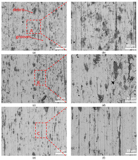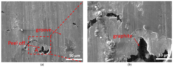 Figure 12 shows the worn surface morphologies of the CGI substrate. There were deep plowing grooves in the CGI’s worn surface as seen in Figure 12b, a magnification of position A. Accompanying the wear processing, the worn debris became embedded into the CGI surface and acted as a fixed indenter, which would form cutting, plowing and grooving on the CGI surface with the so-called grooving wear mode as the main abrasive wear mechanism. Therefore, abrasive wear was the main wear form between the compacted graphite cast iron and GCr15 counterpart.