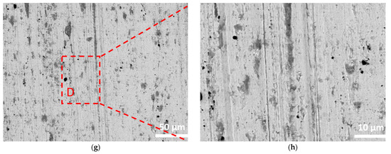 The worn surface morphologies of the iron-based alloy coatings prepared at 45, 50, 55 and 60 A plasma arc currents are shown in Figure 13, where it can be seen that there were no spalling and adhesion characteristics on the iron-based coatings’ worn surface. The main worn characters on the iron-based coatings’ worn surface of were micro cutting furrow and plowings. The plowing grooves on the worn surfaces of the coatings prepared at 45 A plasma arc current was more serious as compared with other coatings. Figure 13b shows the magnification of position A. There were amounts of wear debris on the worn surface of the iron-based coating prepared at 45 A plasma arc current, which was due to the great plastic deformation as well as surface peeling of the coating caused by the hard GCr15 counterpart in the friction process. Meanwhile, the wear debris would induce severe three-body abrasive wear in the sliding processing, which would aggravate the wear process and produce more grooves on the surface of the iron-based coating prepared at 45 A current. Figure 13d–g show the worn surface morphologies of the iron-based coatings prepared at 50 and 55 A plasma arc currents. There were lower grooves and less wear debris as compared to that of the coating prepared at 45 A, which caused the decrease of the wear mass loss. This phenomenon was related to the improved coating hardness with the increase of plasma arc current. When the plasma current increased to 60 A, the iron-based coating had the highest hardness and the precipitated secondary carbides formed in the coatings would be helpful for its wear resistance. As shown in Figure 13g,h, the plowing grooves and wear debris were less than that of the coating prepared at 45, 50 and 55 A plasma arc currents. Meanwhile, it had the lowest wear mass loss 4.2 mg, which exhibited the best wear resistance in the four iron-based coatings. Therefore, the coating’s wear mechanism was abrasive wear, which was similar to the CGI’s wear mechanism.