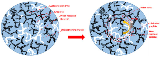 Compacted graphite cast iron (CGI) is commonly used in the automotive and heavy engineering industrial fields for its comprehensive excellent properties as compared to grey cast iron and ductile cast iron [1,2,3]. Wear often occurs in these engineering parts, especially for moving parts, where it becomes the predominant cause of failure [4,5,6]. An effective way to repair and remanufacture failed parts and prolong the components’ useful life is to fabricate a coating to enhance its surface characteristics [7,8,9].