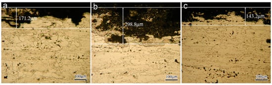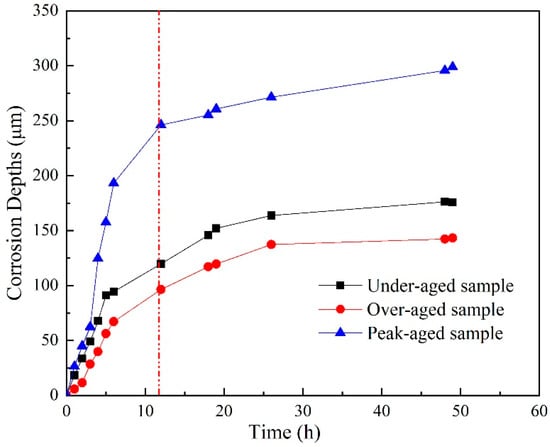 Based on the above OM and OP results of sample immersing in EXCO solution for different hours, corrosion depth curves of the different aged samples were acquired, as shown in Figure 4. In the initial stage of corrosion, the corrosion depth increases fast, and the penetration rate of the peak-aged sample exhibits the fastest in the three samples. However, the penetration rate slows down after immersion for 12 h. In summary, the three aged samples exhibit typical intergranular corrosion during the immersion process, and the exfoliation level is peak-aged sample > under-aged sample > over-aged sample.