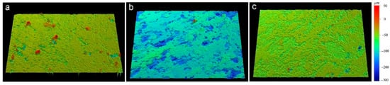 After immersing the EXCO test, the 3D-morphology of different aged samples is shown in Figure 3, and the color stands for height. The surface of the peak-aged sample is much rougher than the other samples. The results suggest that the peak-aged sample was heavily corroded after immersion. Five areas were randomly selected for each sample and analyzed by optical profilometry to generate statistical data of the corrosion depth and area. The corrosion depth falls in a range of 50–260 μm. On average, corrosion depth in the peak-aged sample is deeper and wider than that in the other samples.