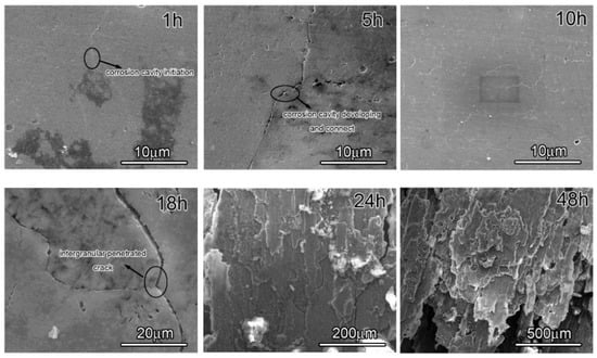 The attack detail of 7050 samples was characterized through observing peak aged sample immersion in EXCO solution for different hours, since the development of intergranular corrosion in the three samples is similar, and the morphology evolution is displayed in Figure 5. The images clearly show that some tiny corrosion cavities are about 100–300 nm and discontinuously distributed along the grain boundary in the sample, at the beginning. Subsequently, the corrosion cavities gradually grow up and increase, and some of them connect into a continuous line with increasing immersion time so that these continuous corrosion cavities become one intergranular penetrated crack. The corrosion crack blunting takes place due to micro-cavities formation and coalescence. Finally, the extensive intergranular penetration and grain fall-out were presented in the samples after an immersion test. Based on the above corrosion morphology evolution, Figure 5 suggests that the initiation and development of exfoliation prefer to arise along the grain boundary, which is closely related to grain boundary precipitation. In summary, in 7050 Al alloys, corrosion cavities are firstly present, and then intergranular penetration develops during the exfoliation process. Additionally, this phenomenon is also proved by other papers [29,30,31].