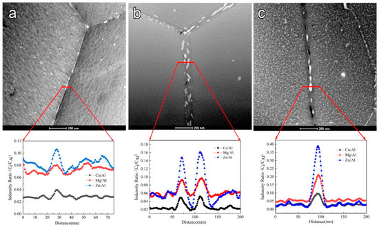 More importantly, the precipitates grow up through alloy element diffusion during the aging process, so different size GBPs result in the heterogeneity of chemical composition in the grain boundary region. It is well known that the heterogeneity of chemistry components induces the initiation of corrosion cavities in the grain boundary region. Birbilis [15] reported that lower Cu or higher Mg, Zn contents result in an apparent potential discrepancy between MgZn(2−x)Cux precipitates and the Al matrix composing some micro galvanic cells [33], thereby the electrochemical corrosion rate is obviously along the grain boundary. To prove the above view, the alloy elements change in the grain boundary region was characterized by transmission electron microscopy with a Nono-EDS model as shown in Figure 7, and the potential discrepancy cross-grain boundary region was tested by AFM as shown in Figure 8.