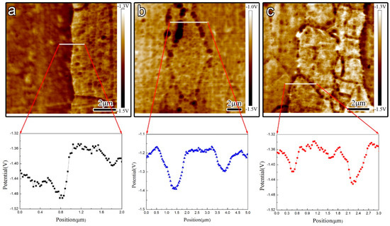 AFM volta potential map and dual section analysis along the white line in polished samples respectively (a) under-aged sample; (b) peak-aged sample; (c) over-aged sample.