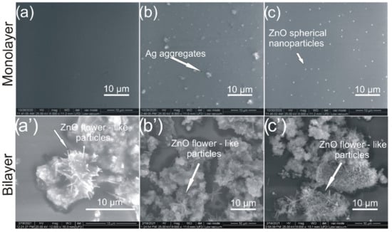 SEM images of the mono- and bilayer coatings deposited on glass slides: (a) A0-I; (a’) A0-II; (b) AOAg-I; (b’) AOAg-II; (c) AOZnO-I; (c’) AOZnO-II.