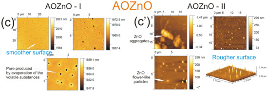 Figure 1b’ and Figure 2b’ shows the SEM and respectively the 2D and 3D AFM images of the bilayer coating AOAg-II. It was shown quite clearly the presence of the inorganic material, silver nanoparticles being distributed densely and relatively evenly in the coating, with calculated average dimensions of ~90–120 nm and some larger particles aggregates, ~200–400 nm. Moreover, the ZnO flower-like particles and particles aggregates, with dimensions of 0.5–5 µm, are highlighted. When compared with A0-II, the calculated average square roughness increased slightly to values of Sq = 16.01 nm.
