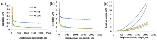 Representative curves for (a) hardness, (b) elastic modulus, and (c) load as a function of indentation depth where blue line = A0-I, orange line = AOAg-I, and green line = AOZnO-I.