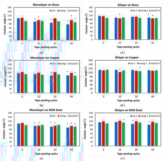 The average contact angle values measured for the mono- (a–c) and bilayer (a’–c’) coatings deposited on different metallic surfaces, initial and after 10, 20 and 40 peeling cycles (* p < 0.05 vs. original coated metallic substrate, before the tape peeling test).