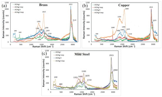 Raman spectra recorded before and after exposure to a pollutant (NO2) were recorded for the Ag NPs doped coatings deposited on: (a) brass plates, (b) copper plates, and (c) mild steel plates.