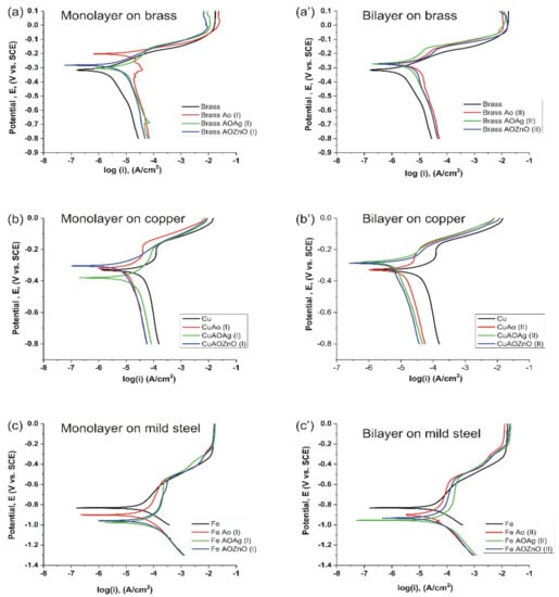 Potentiodynamic Tafel polarization curves of the bare and modified metallic surface in 3.5 wt.% NaCl aqueous solution with monolayer (a–c) and respectively, bilayer (a’–c’) coatings.
