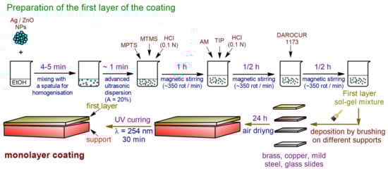 A hydrothermal method adapted from the literature was used for the preparation of spherical ZnO NPs: solutions of Zn2+ and OH− precursors in a ratio of 1:5 were mixed under stirring. Then, an adequate volume of stabilizing and growth agent solution was added (in this case, CTABr was used) until a concentration of 1M was reached. The white precipitate obtained was left to mature for 12 h at 90 °C under reflux. The obtained NPs were separated by centrifugation at 3500 rpm for 5 min and washed repeatedly with water. Then they were dried in a hot air stream at 130 °C and re-dispersed in alcohol for their later use in the composition of the first layer of the coatings. The particles’ diameters were in the range 400–500 nm, measured by the dynamic light scattering technique, using a Zetasizer NanoZS instrument (Malvern Instruments Ltd., Worcestershire, UK).
