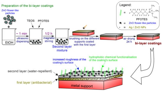 The bi-layered coatings (A0-II, AOAg-II and AOZnO-II) were obtained by adding a second layer to the monolayer coatings described above (A0-I, AOAg-I and AOZnO-I). The second layer was prepared by dispersing 0.04 g ZnO flower-like particles, 0.6 mL PFOTES and 0.6 mL TEOS in 3 mL EtOH. This second layer was added onto the surfaces of the monolayer coatings after their exposure to UV irradiation. Before further characterization, the resulted coatings were allowed to cross-link by sol-gel process at least 24 h in the air, at room temperature (Scheme 2, Table 1).